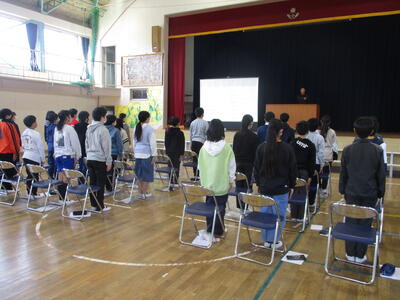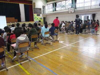 5,6年生は体育館で、交通安全についての動画を見て考える学習をしました。
