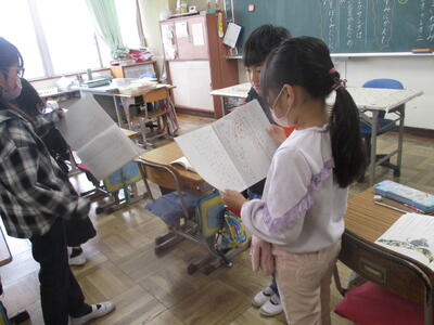 2年生 国語の学習中。友達に自分の考えを伝えています。