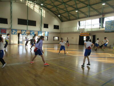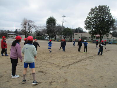 1年生 体育でウォーミングアップ。みんなで鬼ごっこです。