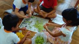 昨日収穫した枝豆を4年生と6年生が鞘剥きを行い、昼食で「ごじる」を食べました。ごじるとは、・・・調べてみました。