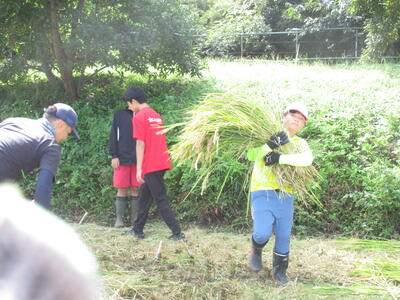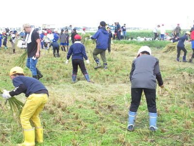 お米の先生の小亀さんに、稲の刈り方、まとめ方、鎌の扱い方などを教えていただきました。稲穂は3束程度をまとめて縛り、脱穀します。まとめる紐がない場合は、稲穂を紐がわりにまとめていくことも教わりました。