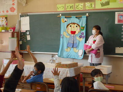 11月4日(水)、1年生は、歯科衛生士さんから、歯磨きの大切さや正しい歯の磨き方について教えて頂きました。用意してくださった大きな「歯」や人形の掲示物を見ながら、楽しく学ぶことができました。本来であれば、みんなで実際に歯磨きができると良かったのですが、ちょっと残念です。ご家庭で、学んできたことを実践できるよう、お声かけをお願いします。歯を大切にしないといけない理由としては単に、「むし歯になると痛くなる」というだけでなく、食べ物の消化を助け、脳の血流も良くする役目があるそうです。みんなで、歯を大切にしっかりと歯磨きをしていきましょう。