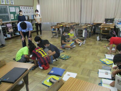 こちらは1階の5年生教室。 なにやら、ひねっております。