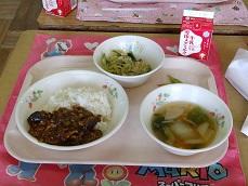 (今日のメニュー:麻婆ナス丼、バンサンスー、中華スープ、枝豆、牛乳)