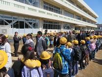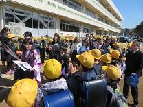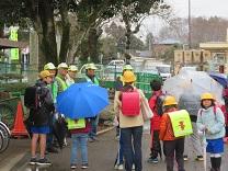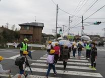 最後の集団下校は雨模様。それでも多くの方々に見守り・付き添いに来ていただきました。児童たちは1年間のお礼を言い、それぞれのコースで下校しました。