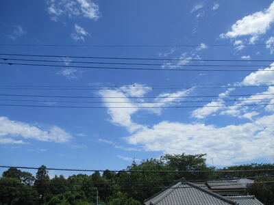 晴天です。 電線に、ツバメがとまっています。 見えますか?