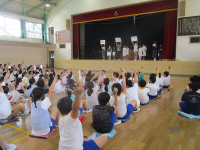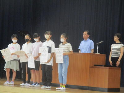 昼に「全校集会」を行いました。 陸上大会の表彰! がんばったね!