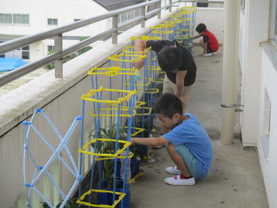 2年生 野菜に水をかけています。 食べられそうになってきたね。