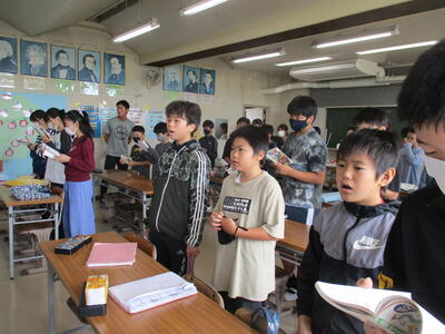 5年生音楽。音楽発表会に向けて歌声をがんばっています。
