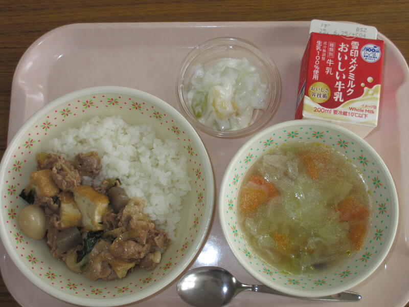 今日は、お肉がたっぷりの煮物が、ご飯によく合う和風メニューでした。ごちそうさまでした。