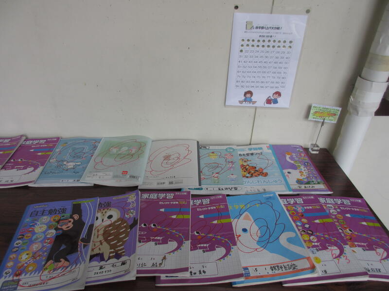 鉛筆「自学盛り上げ大作戦!」は、少しずつ成果が上がっています。13日現在、全校で、「自学ノート1冊終了」の提出が、21冊になりました。校長室前に廊下に、東部っ子ががんばった自学ノートを展示しています。内容は、漢字練習や計算が多いのですが、調べ学習をしたり、運動会の決意表明をしていたり、ことわざとそれに関するイラストを描いたり、様々な工夫が見られます。