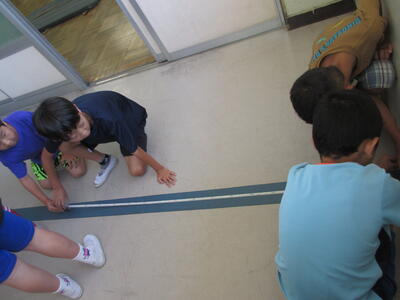 用紙の上部を斜めに切って折ることで、立てることもできるという工夫一杯のカードです。3年生が絵も文もがんばって書いたことが伝わってくる作品です。今日は、メジャーを使って、長さの学習をしました。