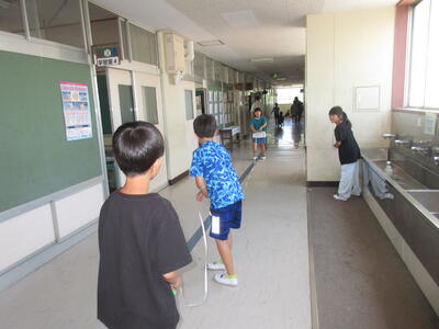 猛暑が予想される日は、午前中の早い時間にプールに入ります。今日は高学年が1時間目からプールに変更となりました。