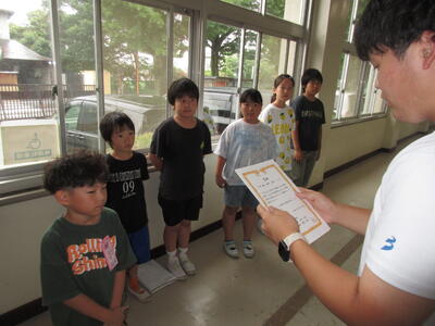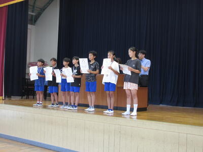 全校集会の後に、市内陸上大会で全力を尽くした選手の皆さんに「記録証」を渡しました。入賞も素晴らしいですが、自己ベストの更新もたくさん出ていました。記録証はその足跡です。