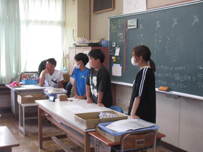 今度は、全員の前で何人か発表します。ホワイトボードに図や矢印を入れて説明を書いた物を使います。
