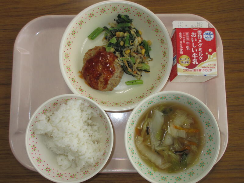 いそマヨサラダは、小松菜がおいしくいただけました。ハンバーグはみんな大好き!ごちそうさまでした。