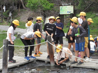 源泉では、水たまりのようなところを触ると、思いのほか温かくて歓声をあげていました。