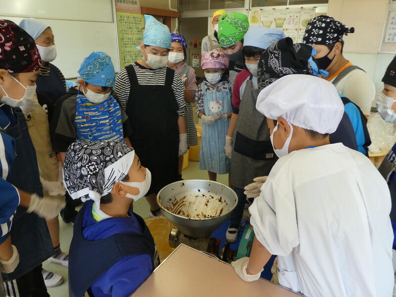 3年生の時にみんなで作ってた味噌。ひっくり返して、よく混ぜることで、更に香り高いおいしい味噌へと変身します。皆一生懸命取り組みました。