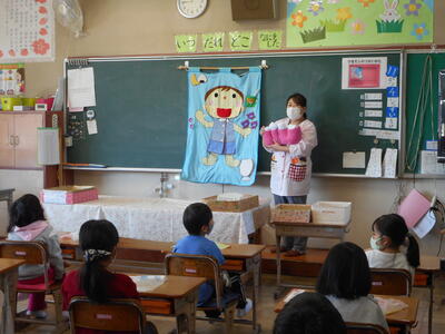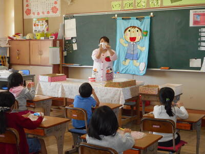 11月4日(水)、1年生は、歯科衛生士さんから、歯磨きの大切さや正しい歯の磨き方について教えて頂きました。用意してくださった大きな「歯」や人形の掲示物を見ながら、楽しく学ぶことができました。本来であれば、みんなで実際に歯磨きができると良かったのですが、ちょっと残念です。ご家庭で、学んできたことを実践できるよう、お声かけをお願いします。歯を大切にしないといけない理由としては単に、「むし歯になると痛くなる」というだけでなく、食べ物の消化を助け、脳の血流も良くする役目があるそうです。みんなで、歯を大切にしっかりと歯磨きをしていきましょう。