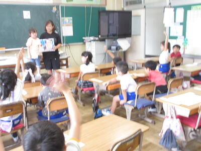 1年生は、楽しい思い出について発表し合いました。友達の発表をよく聞いて、質問がどんどん出ていました。