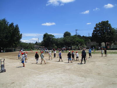 今日の昼は「ロング」です。 全校児童、校庭に出ました。