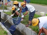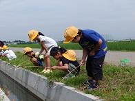 2年生はザリガニを釣り、4年生はどんな生き物がいるかを調査しました。5年生が植えた稲の苗もすくすくと成長していました。