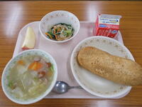 コッペパン 牛乳 ポテトとマカロニのグラタン だいこんとアーモンドのサラダ 野菜スープ |