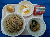 やきそば 牛乳 米粉の手作りケーキ わかめサラダ フルーツ杏仁 |