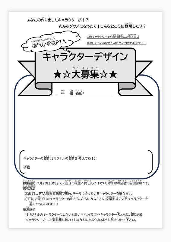 情報宣伝部より 柳沢小学校PTAキャラクターデザイン大募集!