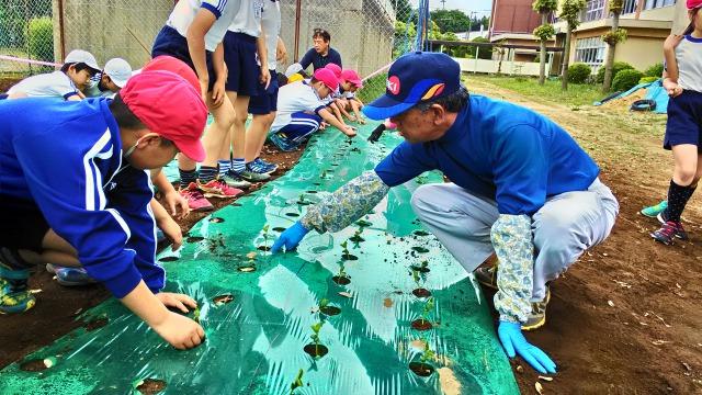 今年度、3年生がえだまめつくりに挑戦してくれることになり、今日は、えだまめ農家の杉下さんに来ていただき、苗植えをしました。