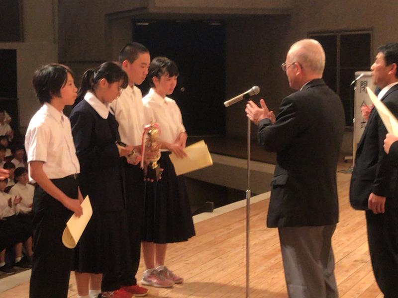 学級対抗リレーは特別のトロフィー!学区である上町地区から70周年記念で贈られたものです!
