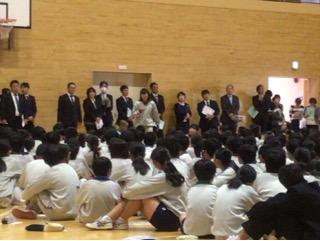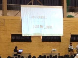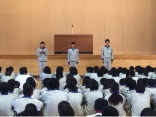 ★美化委員会からは、全校で清掃活動を盛り上げようと、全校討議での話し合いを受けて、先頭に立って一中を綺麗にしますと宣言。また、3年生からは、ただいま受験生真っ最中!ということで、後輩たちに受験生のうんちくを話してもらいました。この時期ならではの光景です。