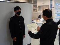 参観の保護者も感染予防対策として、学年入れ替え制、事前アンケートによる抽選にて全席指定としました。生徒の到着時にあわせて入口には保護者の列も見られました。