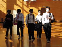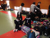 登校時に大きな荷物を持って登校。2泊3日の荷物です。武道場にクラスごとに一時保管します。