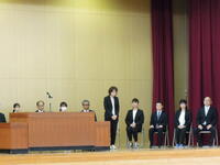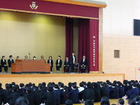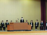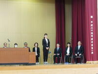 着任した教職員一人ひとりがあいさつし、生徒を代表して「生徒会長」が歓迎のことばを述べました。