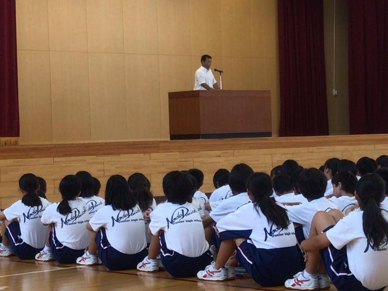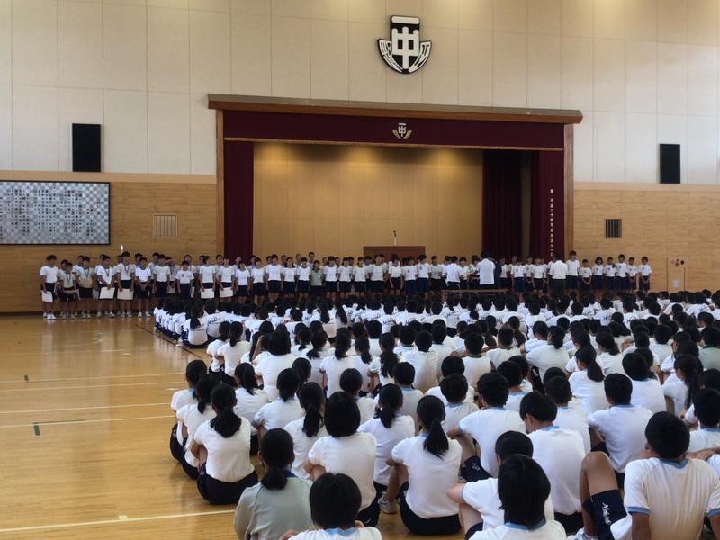 全校生徒が夏休み前と同じ姿で体育館に集まりました。校長先生からは「今ここに、皆さんの元気な姿があることをとてもうれしく思います」とはじめのあいさつがあり、続いて「部活動の件では、葛北大会や新チームでの頑張り」を讃えました。また「文武不岐」(ぶんぶふき)というお話がありました。その後の学級では、担任とその話で盛り上がったクラスもあったようです(^o^)