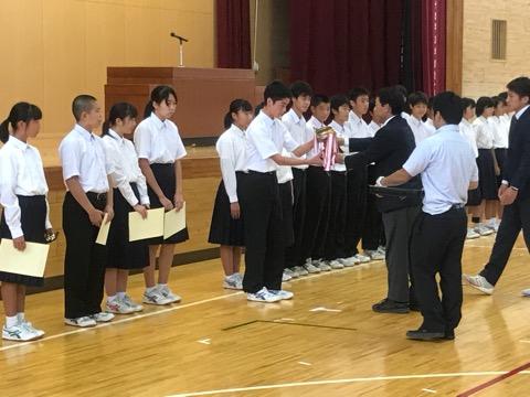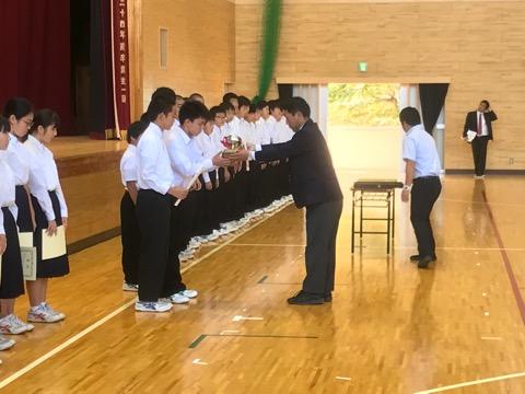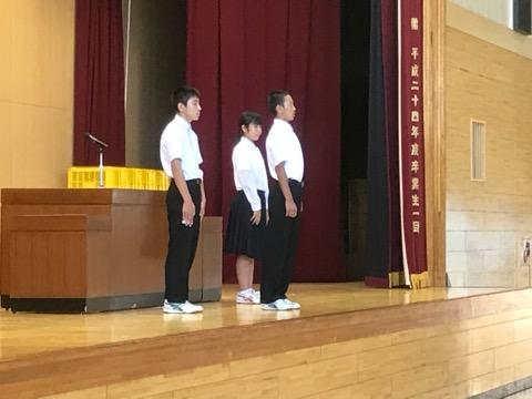 ★審査発表の前に、素敵な表彰式!一中生徒会では、あおいそら挨拶運動を推進しています。いつも門に立って挨拶運動をしている生徒会役員の推薦で各学年から1名のあいさつ賞が、上町地区福祉協議会とあおいそら運動推進委員の方から贈られました。1,2回のあいさつではなく、長い月日の中での推薦です。おめでとうございます(^_^)/