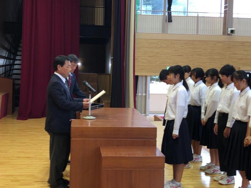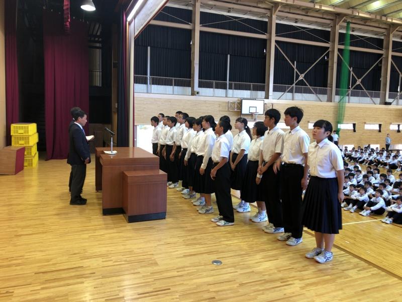 ★後期に入り、生徒会役員も改選されました。また、委員会の委員長も改選され、2年生を中心とした運営が始まります。始業式後には新生徒会と新委員長に校長先生から任命書が渡されました。