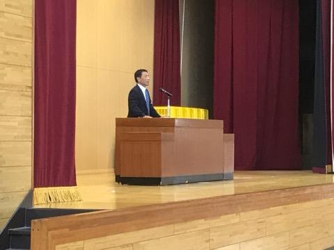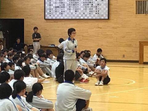 ★後期最初の全校集会は新全校委員長の挨拶から始まりました。生徒会役員同様、2年生が学校全体のリーダーへと変わっていきます。全校生徒を前にしての挨拶はかなり緊張したようです(^^;)