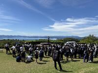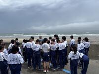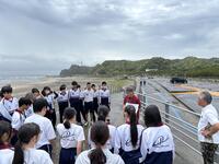 いわき伝承みらい館のガイドさんから、東日本大震災の説明を聞く時には雨も止み、浜辺で当時の様子や災害時の身の守り方について、話を聞くことができました。