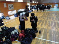 登校時に大きな荷物を持って登校。2泊3日の荷物です。武道場にクラスごとに一時保管します。