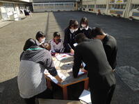 集会後すぐに中庭では学級委員による明日の朝の最終確認が行われていました。