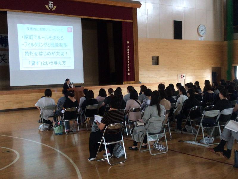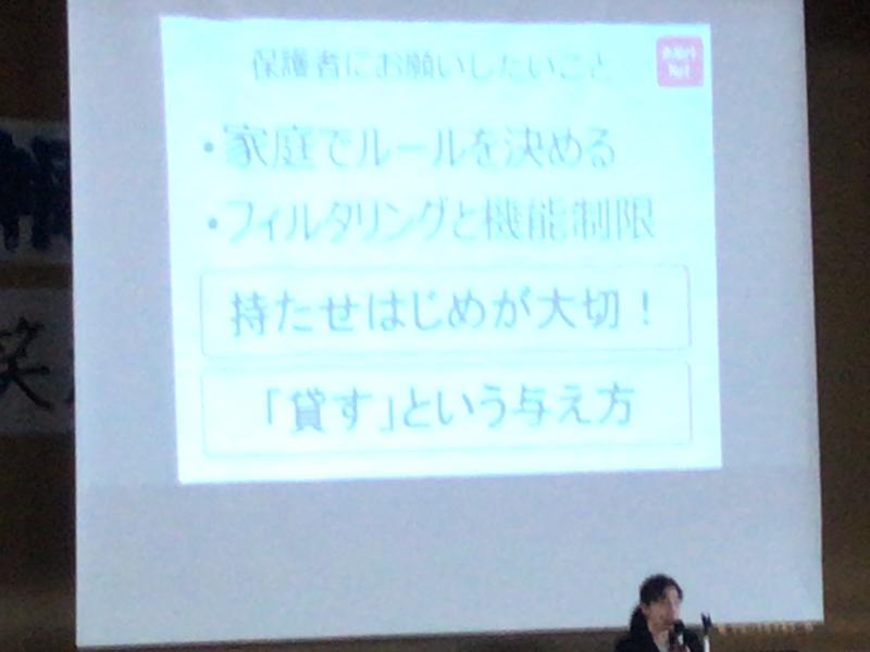 保護者会では、教育ネット、お助けネットインストラクターの三浦講師を招いて、スマートフォンの危険性についてお話をいただきました。先生の話の中で、大人は「持たせる覚悟、持たせない覚悟」どちらにしても、覚悟が必要、だという話が印象に残りました。