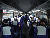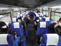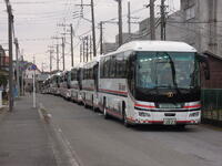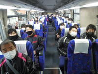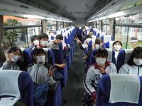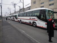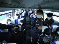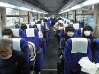 バスに乗車です。感染症対策として、乗車定員が少人数になっているので、7クラスですが11台のバスになりました。
