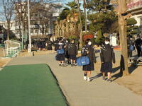 昨年は前日の降雪で白銀の中の登校でしたが、今年は晴天ではあるものの、北風の強い寒中の登校となりました。