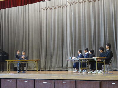 今回は全校集会の形をとり、鈴木有 野田市長さんと対面式で代表生徒が提案や質問をしました。