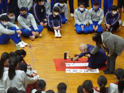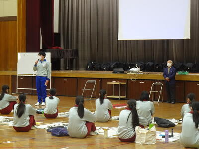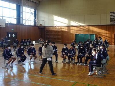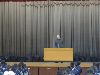 お礼の言葉の後に「全校合唱(日本の四季)」をきいていただき、市長さんからは「健康のために3食しっかり食べてほしい。」「コミュニケーションを大切に何でも話せる仲間をつくってほしい。」「結果よりも過程を大切にしてほしい。」などの中学生時代に大切なことをお話していただきました。