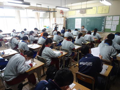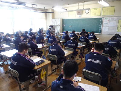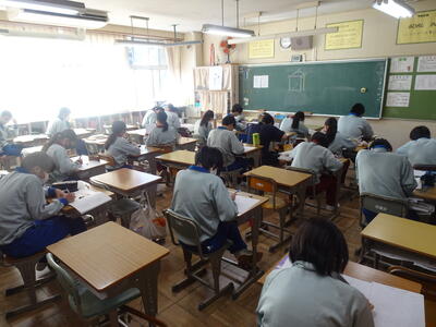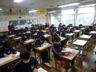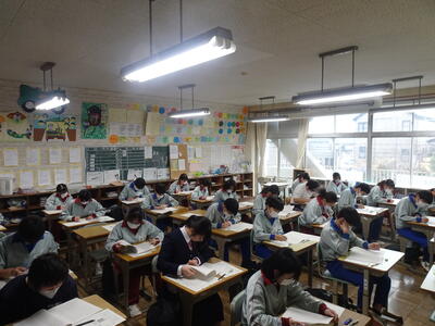 対象は標本抽出で二中の1年2組、2年3組、3年3組が選ばれ、今日は3年3組で実施し、教科は国語と理科をペーパーテスト、質問調査をオンラインで行いました。