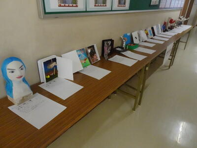 また、校長室前には3年生が、美術の時間につくった作品が「卒業制作選抜展」として展示されています。