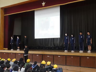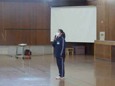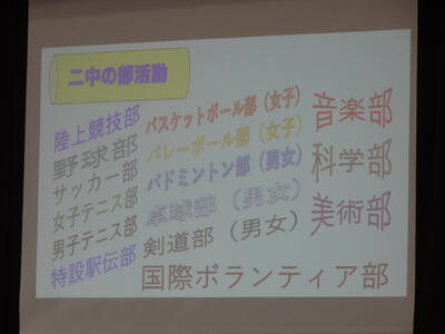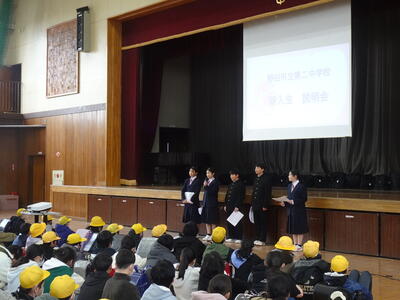 その後、面接やアンケートを行っていた児童が合流し、生徒会執行部、生活委員会、部長会長から「二中の生活」について紹介がありました。